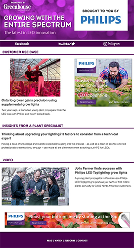 The Philips team recently shared their expertise through Greenhouse Management magazine, featuring lighting advice, case studies, as well as video testimonials from successful greenhouse companies. Check out the emailbelow for full details, and don't forget to visit our Hardgoods, Equipment & Media webpage to learn more from your Ball Seed team about lighting programs.