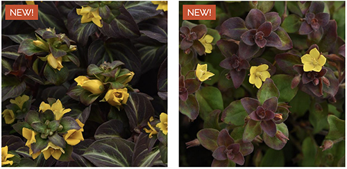 Lysimachia alfredii 'Night Light' provides a colorful mound of attractive foliage and bright yellow flowers while the foliage turns burgundy in the shade. Lysimachia congestiflora 'Firefly' also features burgundy foliage and bright yellow flowers. Both plants prefer the shade and make a beautiful feature in a mix.